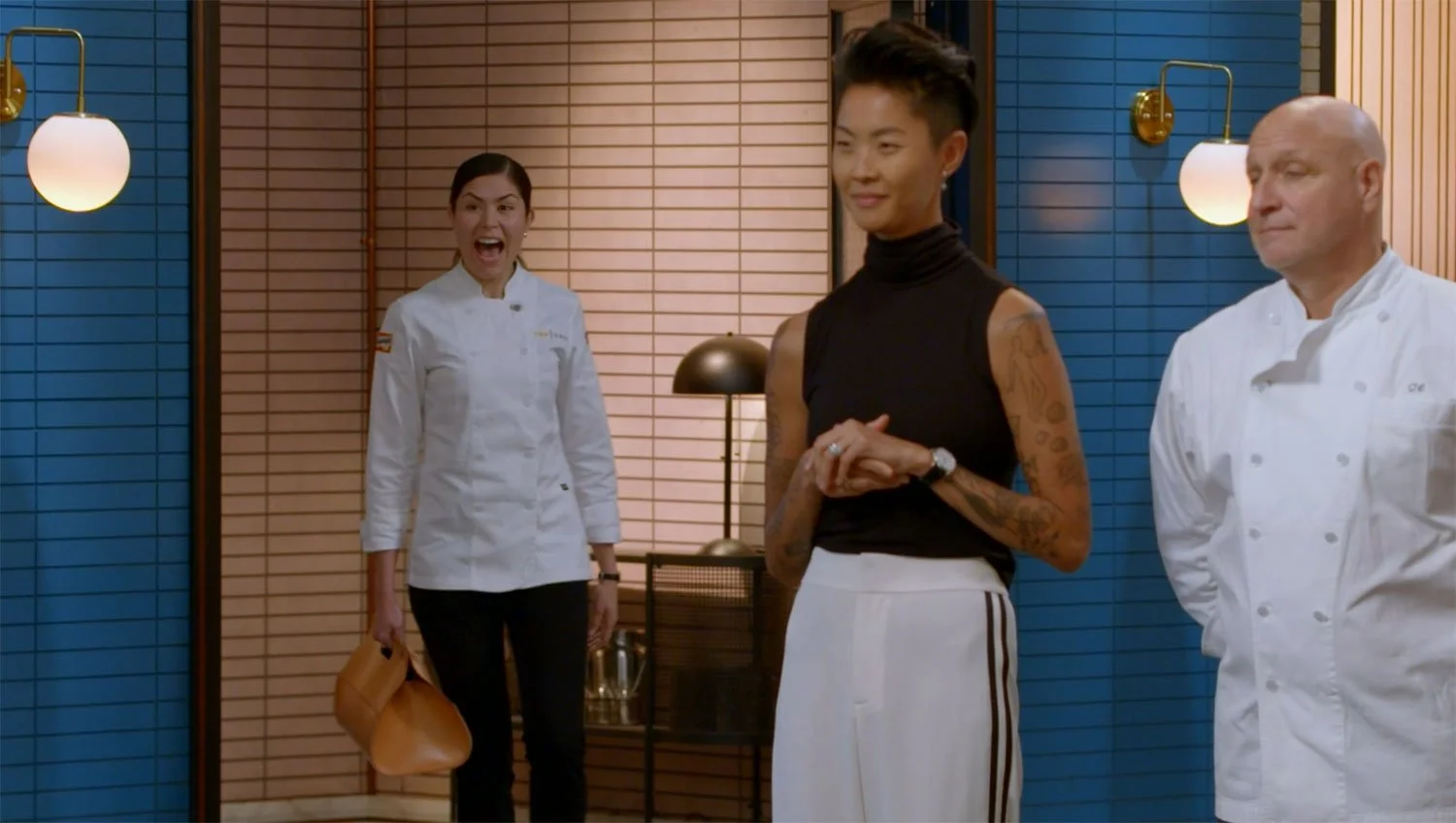 The five remaining chefs walked in and quickly noticed there were six work stations. Chef Laura Ozyilmaz, who won the last ever Last Chance Kitchen, walked in and was reincorporated into the competition.