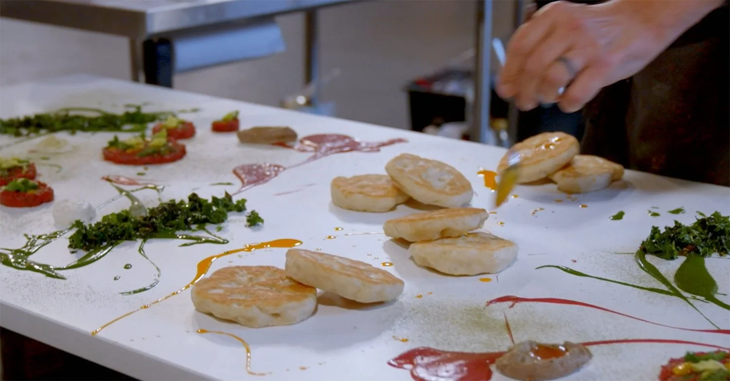 Jacobs: Smoked beet tartare with fried kale and pumpkin seed puree, scallion powder, black garlic labneh, harissa oil, horseradish emulsion, and flat bread.