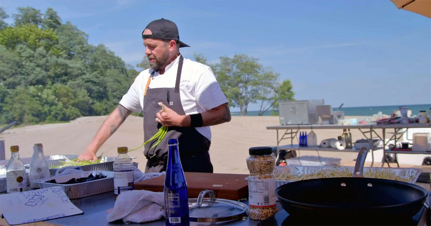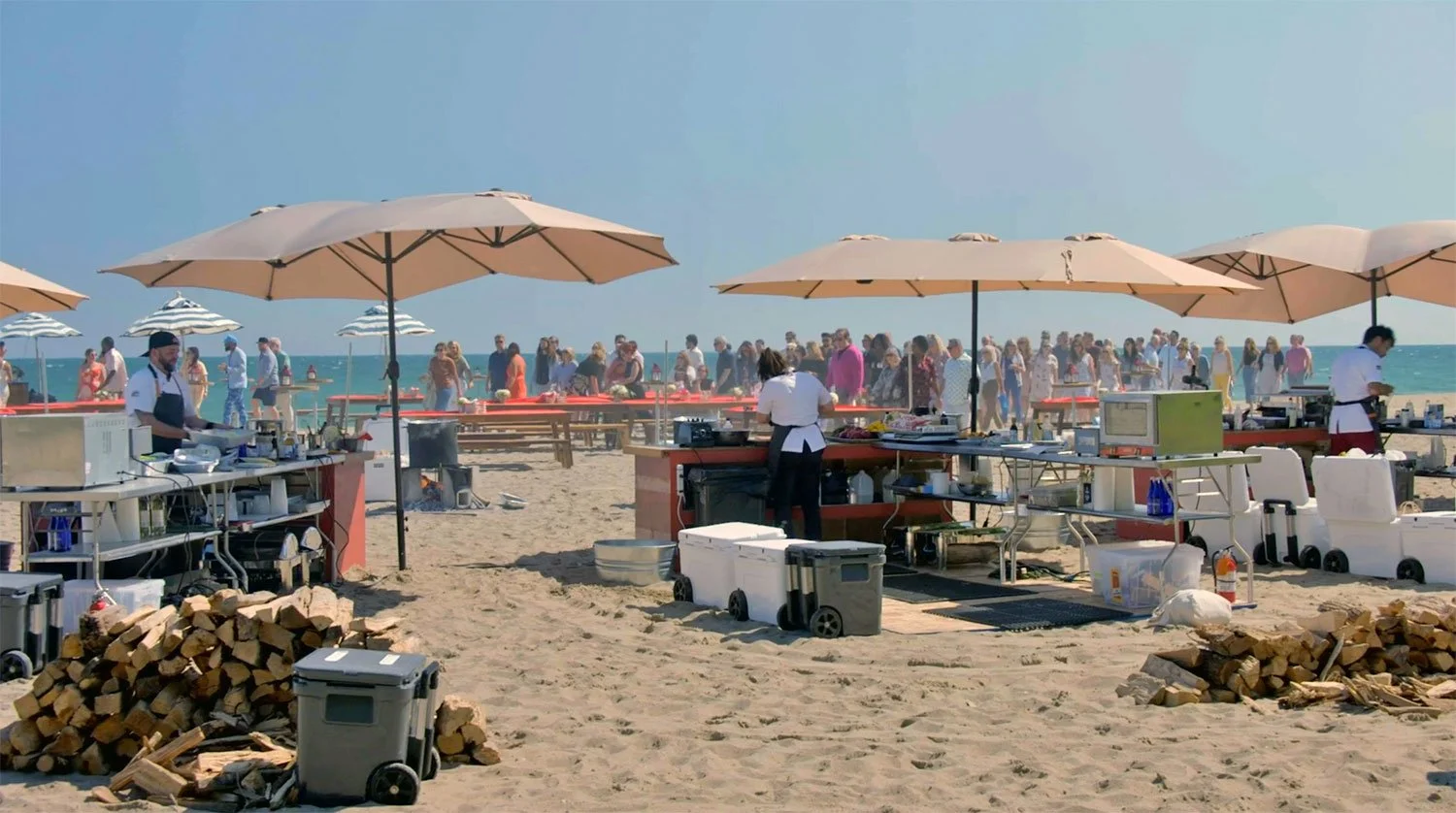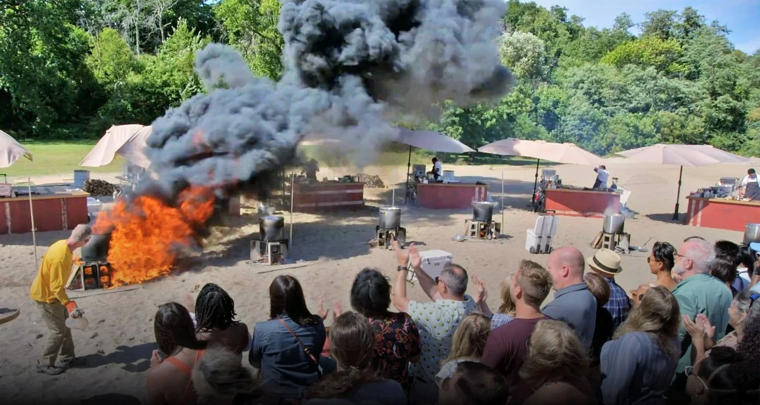 That wasn’t the only issue. They were cooking in the elements, and it was a hot summer day. They had to tend to a roaring fire to keep the boil consistent. It was also windy, ingredients were flying away, and sand was getting everywhere.