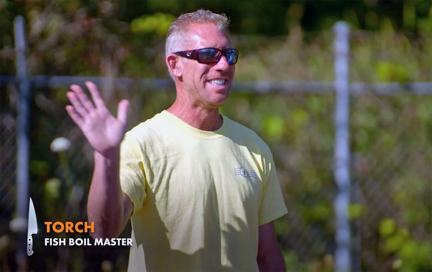 The contestants and chefs mingled and watched as Torch showed them how to prepare a fish boil, a process that includes throwing an open pitcher of kerosene on the fire.